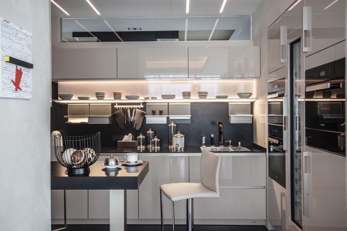 Бюро ub.design создало городской интерьер, где ставший визиткой архитекторов минимализм усложнен деталями в стиле ироничного барокко. Чистое свободное пространство с перетекающими зонами и стеклянными перегородками, исполненное в лаконичном черно-белом варианте, выглядит еще более современным за счет театрально-гротескной мебели и светильников.