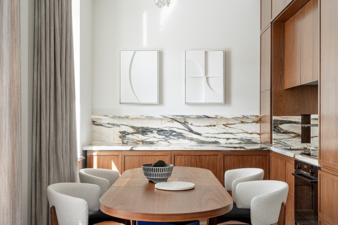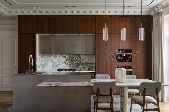 Особенность фасадов здания – исторические архитектурные приемы: арочные окна, крупный руст и «алмазная огранка» декоративных деталей. Именно они вдохновили автора на создание интерьера с необычной пластикой, деликатными рельефными орнаментами и элементами неоклассики.