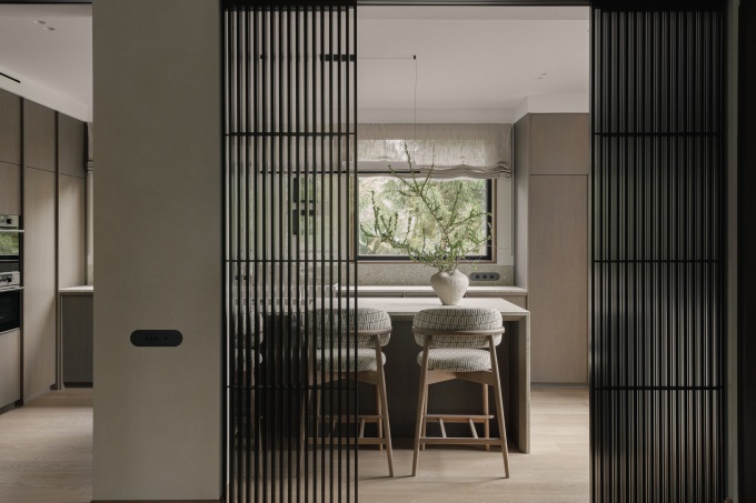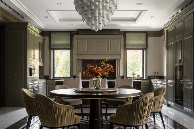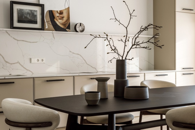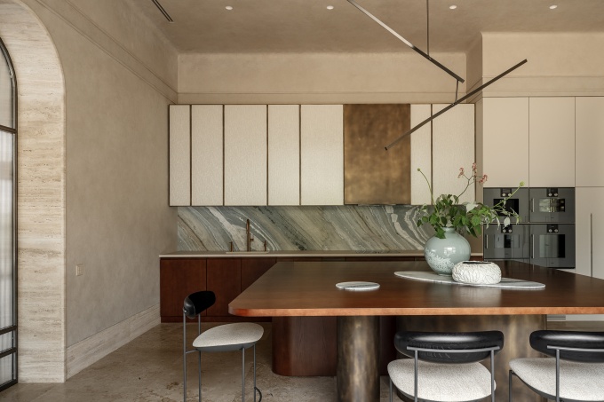 «Я не присутствовала на первой встрече, мне передали только запись разговора, - рассказывает архитектор. – В ней заказчица озвучила основные пожелания: связь интерьера с экстерьером, индивидуальная вневременная стилистка с отсылками к ар-деко, авторские, но без экстравагантности решения, нейтральная цветовая палитра с нюансной деталировкой и каменный пол в помещениях первого этажа. Сначала меня смущал камень, так как почти любой мрамор имеет активный рисунок и берет на себя много внимания. Но мне удалось найти идеальный вариант – юрский мрамор, у него абсолютно нейтральный цвет и сложная текстура с включением окаменелостей». В итоге именно камень задал основную линию: мягкие бежево-песочные оттенки и тактильные фактуры объединили весь интерьер. Благодаря такому решению все 1300 кв. м воспринимаются как единое цельное пространство, очень комфортное для проживания. Нейтральный цвет хорошо подчеркивает архитектуру и пластику стен и оттеняет цветовые акценты, раритетный винтаж и искусство.