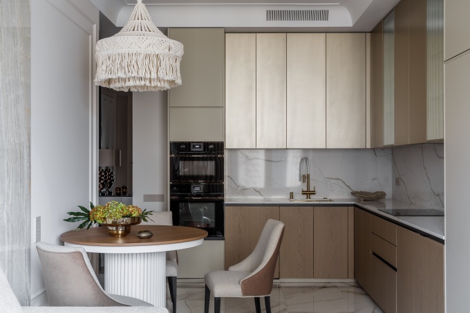 Бытовую технику, которая всегда является показателем статуса и достатка заказчиков, в кухнях, тяготеющих к минимализму или хай-теку, выставляют напоказ. В классических кухнях все техническую начинку прячут за мебельными фасадами: створками или раздвижными перегородками с электроприводами.