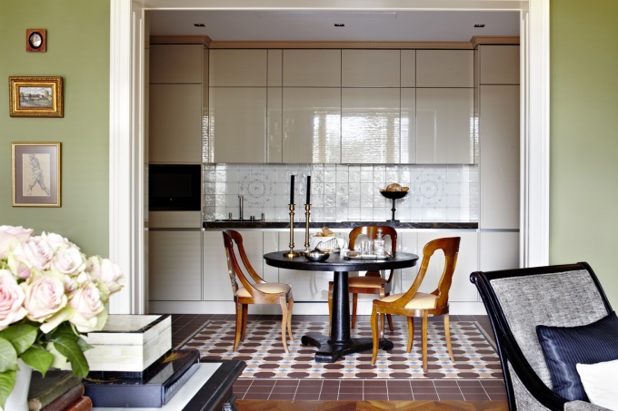 Квартира расположена в старинном доме в стиле модерн, ее окна выходят на бульвар, где весной цветут каштаны… Авторы проекта учли эти особенности места и создали интерьер в сложной сиренево-зеленой цветовой гамме в стиле русского модерна с плотным декором с растительным орнаментом.