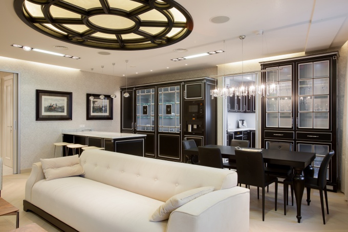 Отличительная особенность дизайн-проекта квартиры – особая аура историзма, свойственная скорее аристократичным особнякам в центре Москвы, чем современной новостройке. Изначально квартира была похожа на холодную, абсолютно не приспособленную к жизни бетонную «коробку» с неудобными комнатами-пеналами, узкими длинными коридорами, большими техническими помещениями, смежными спальнями, нелогично расположенными дверями, несущими балками по центру помещений.