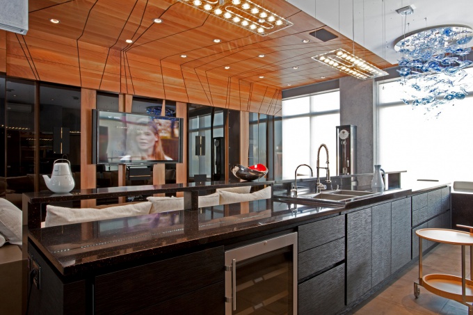 Стены, полы, лепные карнизы, фурнитура, встроенная мебель были созданы по авторским эскизам и чертежам. Отдельного внимания заслуживает декоративная роспись стен, а также светильники из хрусталя и чистого серебра, созданные в единственном экземпляре под проект.