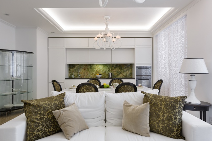 Неоклассическая, исполненная в молочно-белых тонах квартира в центре Москвы предназначена для временного проживания семьи петербуржцев с двумя детьми 15-ти и 8-ти лет. Заказчики мечтали о светлом, изысканном и сдержанном интерьере в современной эстетике с легким намеком на классику. Чтобы белоснежный интерьер не выглядел однообразно, авторы проекта предложили добавить ярких акцентов – панно и декоративные вставки из редкого зеленого оникса.