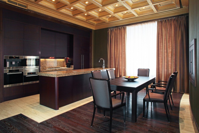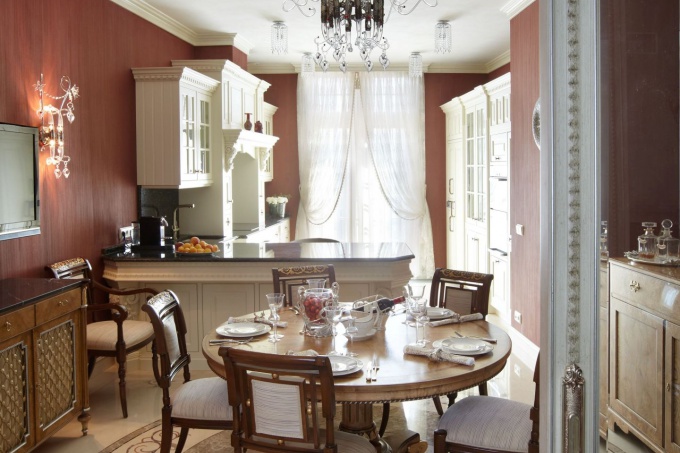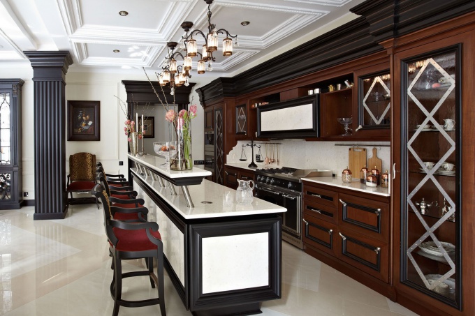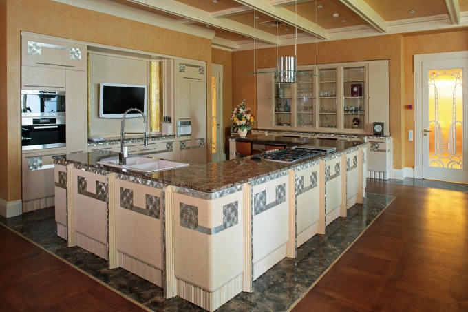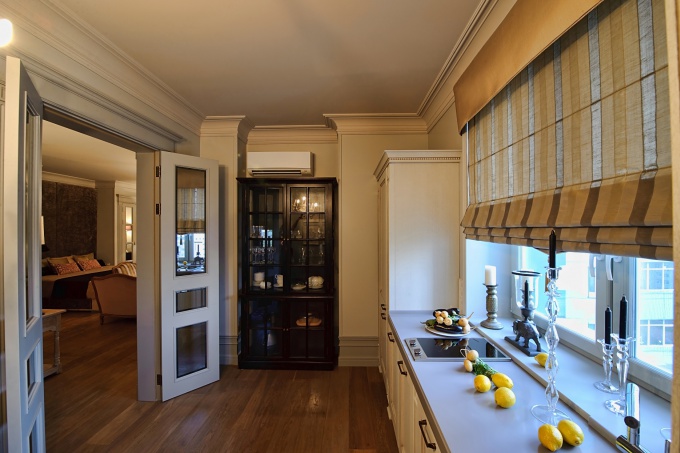 Здесь гармонично существуют лепные карнизы, наборный паркет, панно из натурального камня, буазери, а также раздвижные перегородки из матированного стекла с вензелями, люстры из муранского стекла, зеркала в пышных рамах и мебель с романтическим флером.