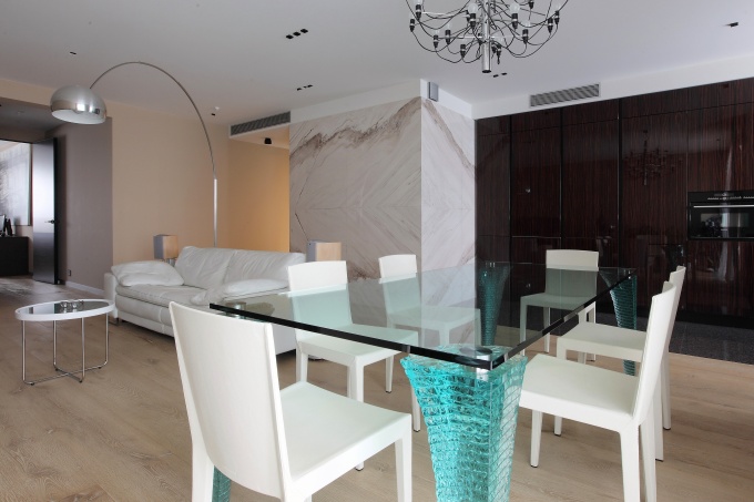Заказчики уже некоторое время жили в классическом интерьере и свою новую квартиру они видели современной, динамичной, цветной, с яркой эмоциональностью. О минимализме речи и не могло быть, поэтому авторы проекта сделали основную ставку на пластику пространства, а также теплую фактуру дерева, природного оникса, текстиль насыщенных цветов. На стилистку интерьера во многом повлияла коллекция современная искусства, которую заказчики собирали долгие годы.