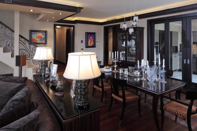 Эклектичный интерьер, оригинальный и несколько театральный – так сформулировали задачу заказчики. Именно поэтому лишь единичные предметы обстановки были куплены по каталогам. Основная часть предметов декора была сделана вручную, по индивидуальным эскизам и чертежам.