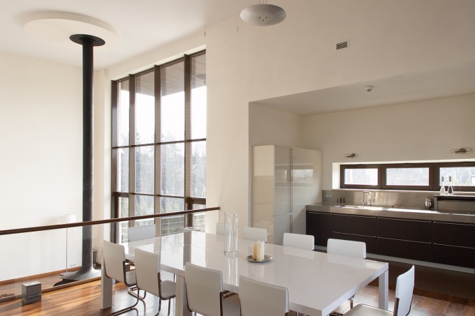 Это позволило сделать композицию дома с угловым выступающим элементом, выходящим на оба фасада. Здание облицовано белым финским кирпичом и натуральным деревом. Дом выглядит компактным: при общей площади дома в 360 кв. м площадь застройки составляет 191 кв. м. Облик дома формируют две открытые террасы (одну на крыше, другую – с выходом в сад из гостиной), а участка – теннисная площадка под навесом и беседка.