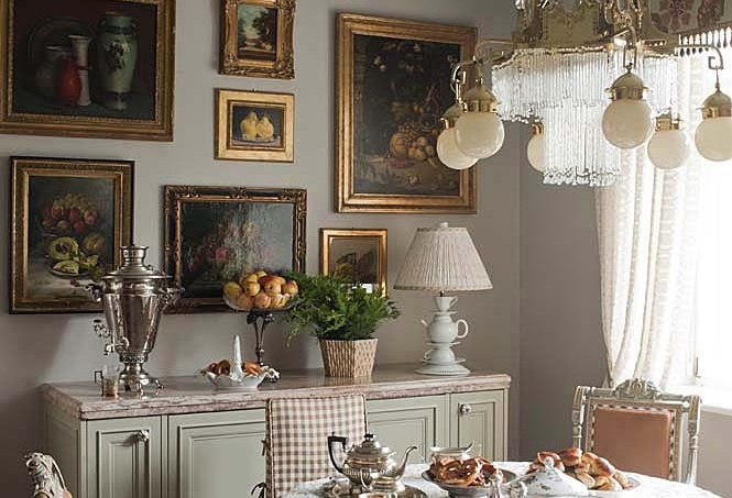 Разномастная мебель, повседневный фарфор, картины и аксессуары, которые хранят историю семьи и роскошные ткани – такова основная идея этого близкого сердцу каждого русского человека, ностальгического проекта.
