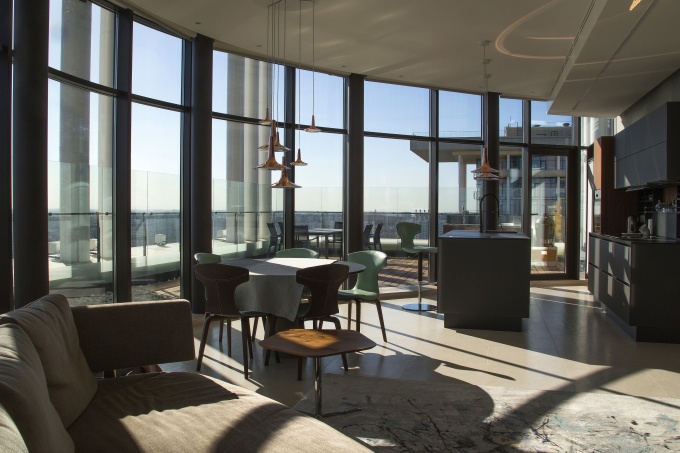 Расположенная на последнем этаже новой столичной высотки на юге Москвы квартира общей площадью 286 кв. м стала для архитектора Ирины Никифоровой настоящим вызовом. Пространство в форме половины эллипса с панорамным остеклением по радиусной стороне, да еще и вписанное в квадратный объем открытой террасы, – испытание для любого архитектора. Больше всего квартира похожа на корабль, который парит в небе, его «нос» обращен к горизонту, а «корма» примыкает к лифтовому холлу здания и максимально затемнена…