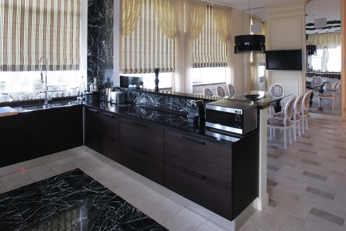Основная цветовая гамма интерьера квартиры – контрастная, черная с белым, поэтому авторы сделали акцент на фактуру материалов: мрамор и венге.