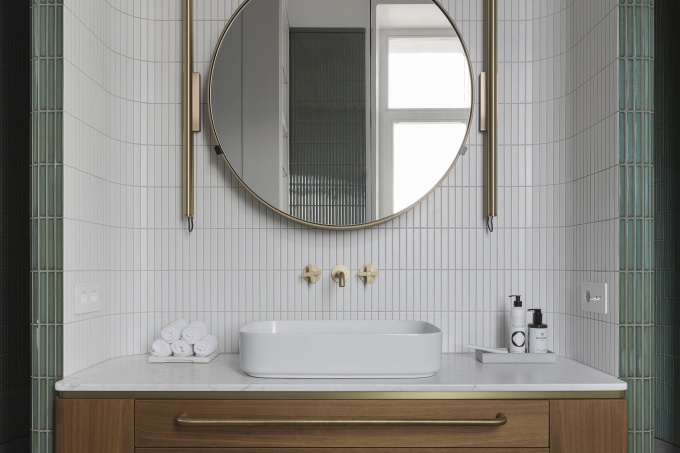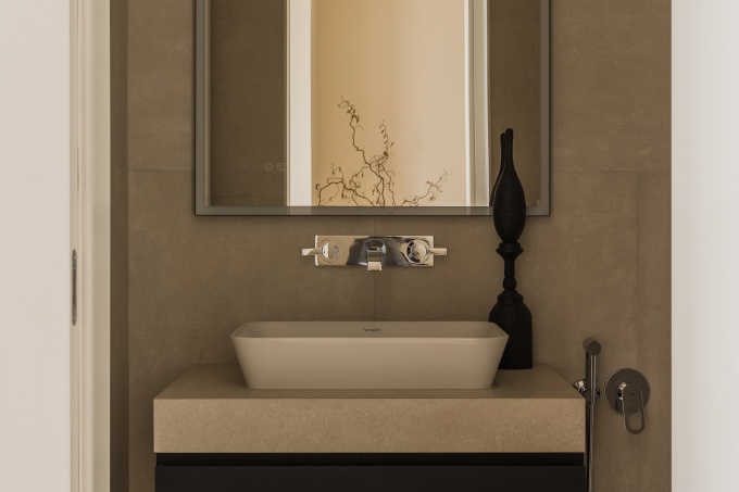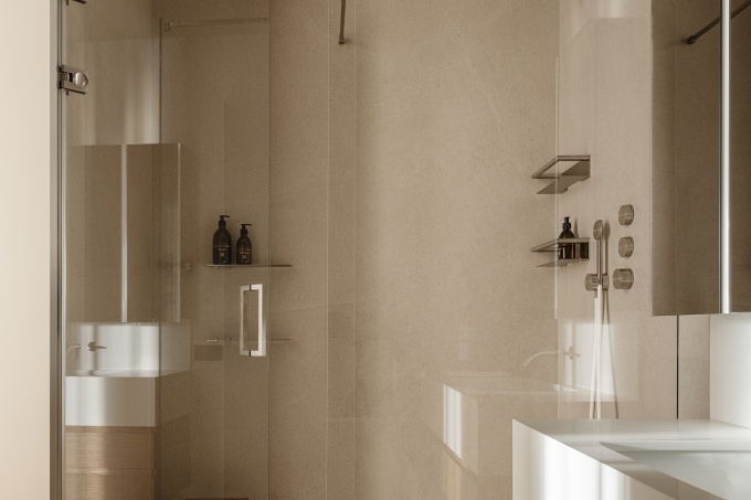 В основу дизайна легли теплые, светлые оттенки: от молочного до песочного. Элегантность воздушного интерьера подчеркивают изделия из латуни, а общий образ усложняют контрастные текстуры дерева и мрамора Arabescato.