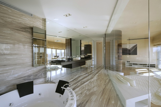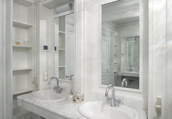 На облик квартиры повиляли образы трех европейских городов: Рима, Парижа и Лондона. В основу интерьерного решения легли итальянские мотивы: мраморные полы, колонны, широкие карнизы. В процессе работы дизайн-проект обогатился приметами французского и английского стилей, став чуть менее строгим, более эклектичным и элегантным.