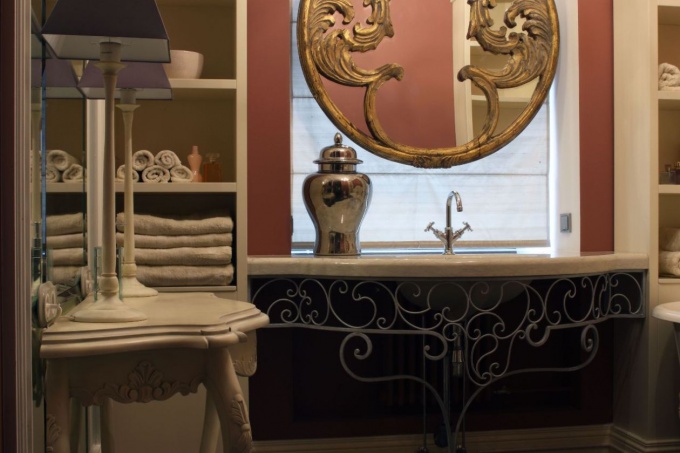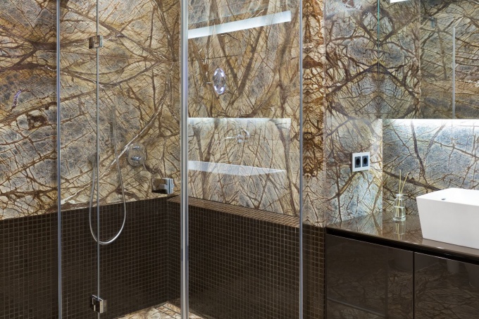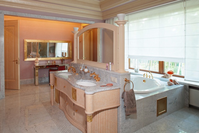 Здесь гармонично существуют лепные карнизы, наборный паркет, панно из натурального камня, буазери, а также раздвижные перегородки из матированного стекла с вензелями, люстры из муранского стекла, зеркала в пышных рамах и мебель с романтическим флером.