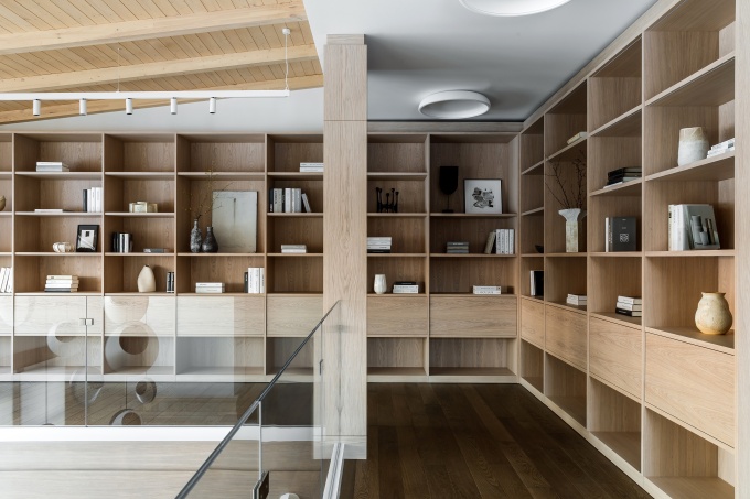 С заказчиками она знакома давно, неоднократно вместе работала и хорошо знает их вкусы и предпочтения. Задача стояла создать интерьер с теплой и гостеприимной атмосферой, отразить в деталях индивидуальность хозяев и наполнить пространство искусством. Заказчики обратились с уже готовым проектом дома: строительство уже активно шло, но они опасались, что современная архитектура сделает семейный дом слишком холодным. «Мы начали с самого начала. Полностью поменяли проект, внесли изменения в готовую планировку, «утеплили» и смягчили пространство и вывели на первый план натуральную фактуру дерева. Оставаясь верными минималистским фасадам, мы создали в интерьере настроение укутывающего уюта», - рассказывает автор проекта. Решения принимались быстро, работа шла буквально с листа, поэтому интерьер получился таким живым и волнующим.