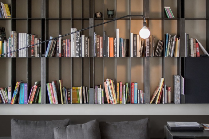 Кроме того, в качестве обязательного условия заказчики обозначили наличие сквозной планировочной триады: спальня хозяев – ванная – гардеробная комната. При создании дизайн-проекта выбор был сделан в пользу разумного минимализма. Ключом к образу квартиры являются оригинальные стеллажи с правильной геометрией и ломаный ритм потолка.