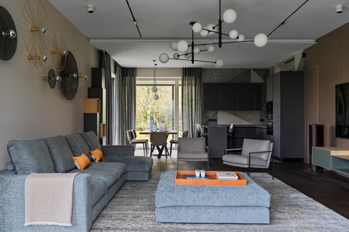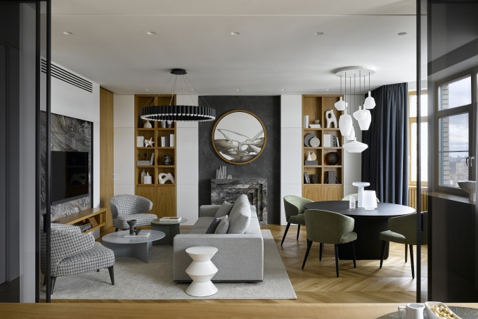 Заказчик – топ-менеджер финтехкомпании, интересуется последними техническими достижениями, его супруга увлекается современным искусством, а сын-тинэйджер занимается киберспортом. Все вместе они хотели современную и «продвинутую» квартиру с качественными материалами, эффектными деталями, но без китча. На облик интерьера во многом повлияло расположение дома и панорамные виды из окон на приватный парк с одной стороны и на магистраль с перспективой высоток с другой. Сдержанная природная палитра и урбанистические акценты стали основой декоративного решения пространства.