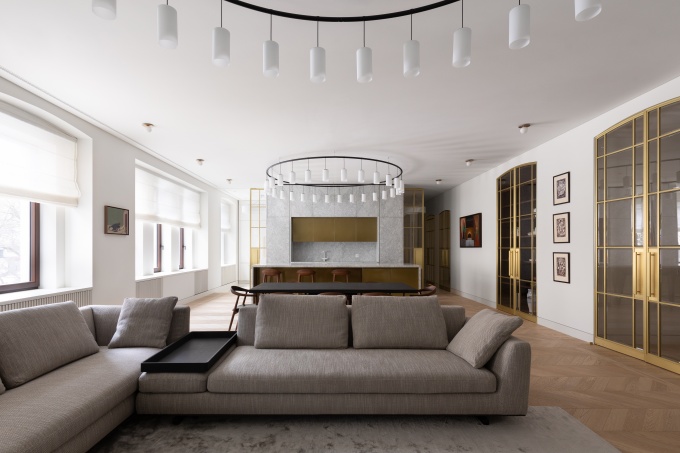 Пентхаус площадью 350 кв. м расположен в новом жилом комплексе с видом на акваторию Санкт-Петербурга. Заказчики имеют очень хороший вкус и прекрасно ориентируются в дизайне, они поставили задачу спроектировать квартиру с внушительным функционалом и современным наполнением в духе тихой роскоши. Нужно было спроектировать отдельный мастер-блок, гостевое крыло, спортзал, санузел с хаммамом, постирочную, а также большую зону кухни-столовой и гостиной с домашним кинотеатром. Мебель выбрали проверенных итальянских брендов, которые задают тон на рынке. Отделочные материалы – максимально натуральные, тактильно и визуально приятные.