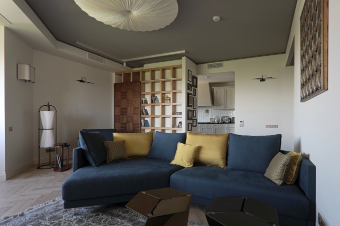 Кроме того, в качестве обязательного условия заказчики обозначили наличие сквозной планировочной триады: спальня хозяев – ванная – гардеробная комната. При создании дизайн-проекта выбор был сделан в пользу разумного минимализма. Ключом к образу квартиры являются оригинальные стеллажи с правильной геометрией и ломаный ритм потолка.