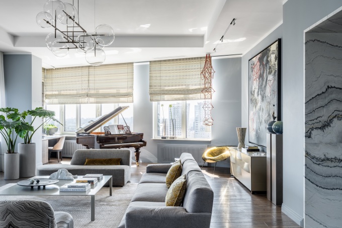 Молодой успешный бизнесмен приобрел квартиру в новом жилом комплексе премиум-класса с потрясающим видовым характеристиками: из панорамных окон с одной стороны открываются виды на Кутузовский проспект и Москва-Сити и на Парк Победы и Поклонную гору – с другой. Задачу сформулировал лаконично: «Мне нужен воздух, пространство и цвет. Каждая вещь должна иметь смысл и пользу. И обязательно – технологии. Умный дом, качественная акустика, автоматические шторы – все самое современное и удобное». Сохранив существующую планировку и частичную отделку, дизайнер создала нетривиальный интерьер, который наполняет энергией.