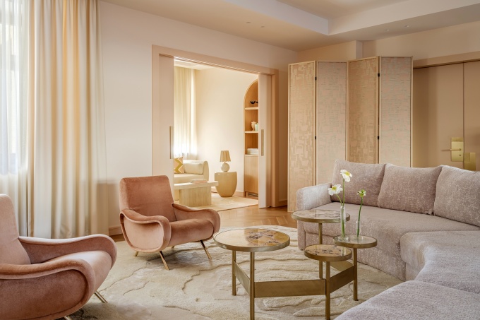 В основу дизайна легли теплые, светлые оттенки: от молочного до песочного. Элегантность воздушного интерьера подчеркивают изделия из латуни, а общий образ усложняют контрастные текстуры дерева и мрамора Arabescato.