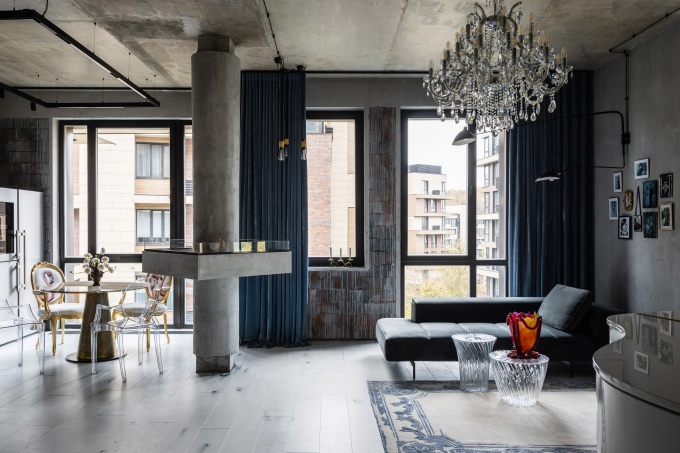 Техническое задание включало объединение двух квартир, расположенных в жилом комплексе «Олимпийская Ривьера», в функциональное и зрелищное пространство для леди, которая увлекается экстремальными видами спорта и креативно относится к дизайну. Она обязательно хотела оставить строительный кирпич и бетон, притом, как есть, без прикрас со всеми неровностями и следами от деревянной опалубки и стыковочными швами. Их грубая фактура стала основой интерьера и задала неформальную стилистку.