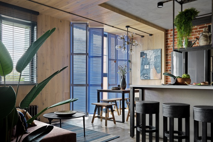 Темный кирпичный фасад, большие внутренние объемы, высокие окна и потолки и другие характерные элементы фабричной эстетики вдохновили на создание очень подробного фактурного интерьера, стилистику которого сами авторы определяют как городской фьюжн. Интерьер получился живым, с обволакивающей атмосферой и тактильными поверхностями, главное в нем – красота природных фактур и мастерское соединение брутализма и мягкости.