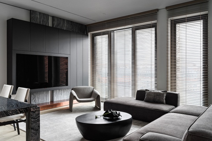 Чтобы связать интерьер с экстерьером, дизайнер Мария Белоусова, руководитель бюро Belousova.interior, предложила сделать акцентом жилого пространства панели из меди и выстроила медный куб, который стал эффектной доминантой минималистичной квартиры. В целом, заказчики хотели современный, сдержанный и запоминающийся интерьер: строгий, монохромный, с большим количеством скрытых мест хранения, без визуального шума, с воздухом и свободой в пространстве.