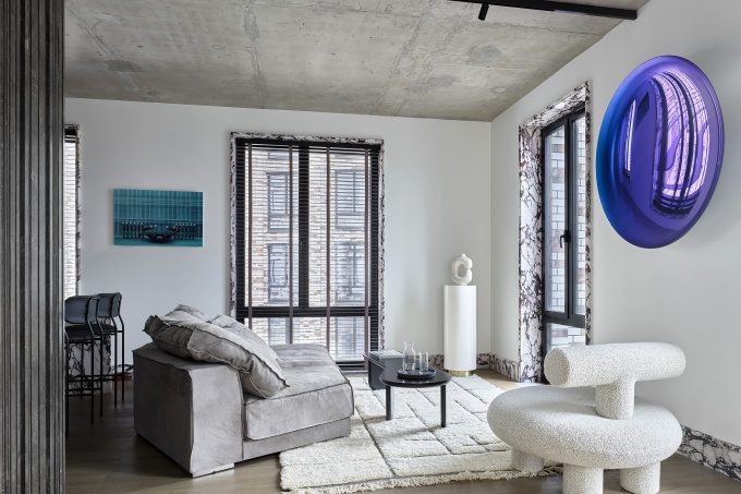 Квартира площадью 89 кв. м расположена на высоком этаже нового жилого комплекса в активно развивающемся московском районе. Из его панорамных окон видны знаковые столичные высотки и пестрые фасады соседних домов. «Я изначально хотела сделать мраморные оконные откосы. Но не могла решить, из какого вида камня: темно-серого или рябого. Но, посмотрев в окно, выбрала второй – он перекликается с окружающей архитектурой. Из этого же вида мрамора мы изготовили плинтусы, кухонный остров, раковину в ванной комнате и пол в прихожей», - рассказывает автор проекта.
