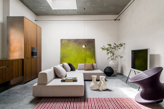 Заказчики хотели получить аскетичный и эргономичный интерьер в духе магазина Muji, они даже устроили тендер, который выиграло бюро RE, предложив проект в стилистике japanordic. Его идея – чистота, медитативная открытость, честные брутальные фактуры и простая геометрия. В квартире получилось минимум декоративных подробностей, а максимум воздуха, света и атмосферы. А ее художественный образ формирует эффектный этно-микс, с помощью современных технологий и материалов адаптированный к сегодняшнему дню.