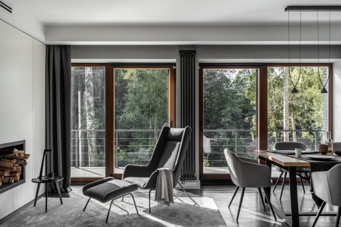 Задачу сформулировали четко: создать спокойное, функциональное, не перегруженное деталями пространство, где можно отдохнуть от городской суеты и насладиться красотой природы. «Главным героем этого дома является сама природа, меняющая свой облик в зависимости от сезона и проникающая в интерьер через панорамные окна. Поэтому при выборе отделочных материалов мы сделали ставку на природные текстуры – дерево, камень, кожу. Это позволило создать современный интерьер с расслабляющей атмосферой, полностью гармонирующей с окружением за окном», - отмечают авторы проекта.