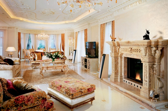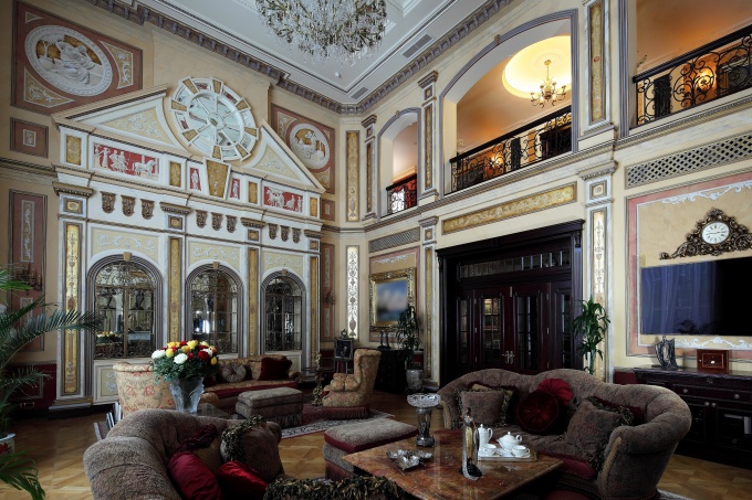 Создавая дворцовый стиль в интерьере гостиной, можно использовать только натуральные, дорогостоящие материалы, эксклюзивные предметы интерьера. Отделкой стенных поверхностей способны служить деревянные панели, ткани, гобелены. Придать изысканность интерьеру помогут лепные украшения, фрески, позолота. Особым шиком отличаются помещения, декорированные колоннами, пилястрами.