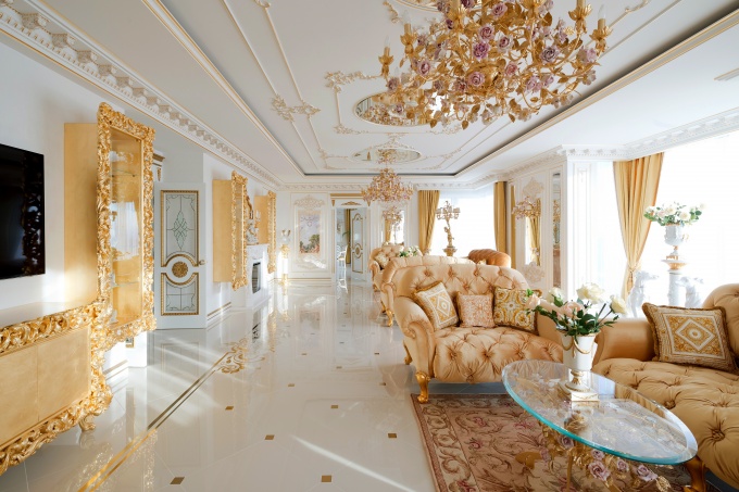 Эксклюзивный дизайн гостиной в дворцовом стиле позволяет создать роскошную, просторную, светлую комнату. Безупречно реализовать подобный проект возможно в помещениях с высокими потолками, большими окнами. Многообразие изысканных элементов декора предоставляет большие возможности дизайнерам для создания уникальных интерьеров.