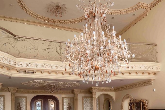 Большое внимание уделяется подбору осветительных приборов. Игра света в хрустальных подвесках массивной люстры и многочисленных настенных бра подчеркивают роскошь декоративного оформления помещения.