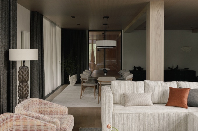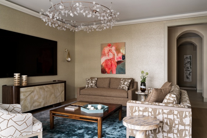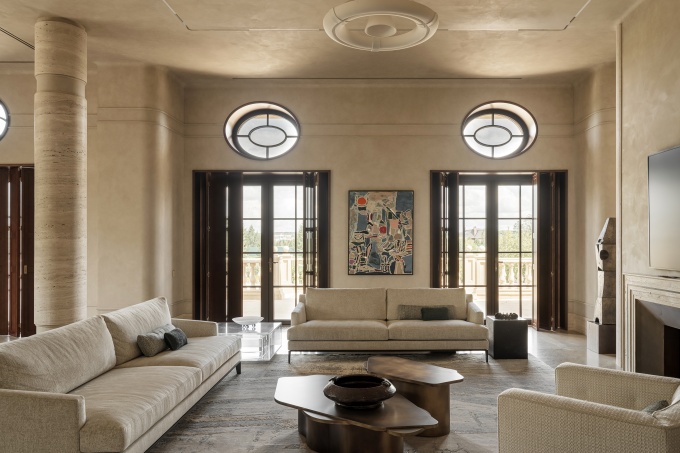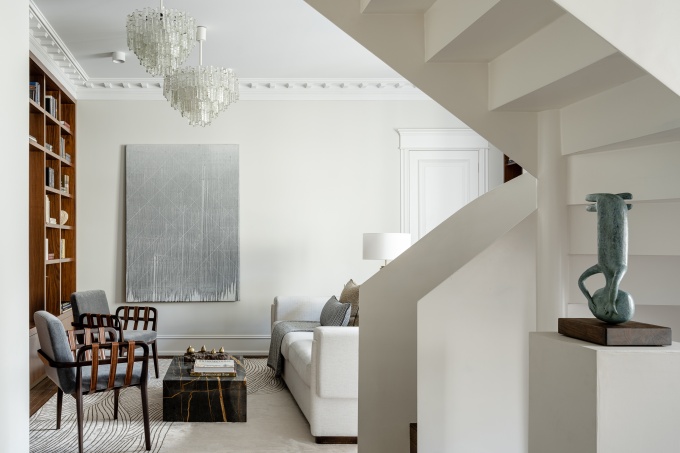«Я не присутствовала на первой встрече, мне передали только запись разговора, - рассказывает архитектор. – В ней заказчица озвучила основные пожелания: связь интерьера с экстерьером, индивидуальная вневременная стилистка с отсылками к ар-деко, авторские, но без экстравагантности решения, нейтральная цветовая палитра с нюансной деталировкой и каменный пол в помещениях первого этажа. Сначала меня смущал камень, так как почти любой мрамор имеет активный рисунок и берет на себя много внимания. Но мне удалось найти идеальный вариант – юрский мрамор, у него абсолютно нейтральный цвет и сложная текстура с включением окаменелостей». В итоге именно камень задал основную линию: мягкие бежево-песочные оттенки и тактильные фактуры объединили весь интерьер. Благодаря такому решению все 1300 кв. м воспринимаются как единое цельное пространство, очень комфортное для проживания. Нейтральный цвет хорошо подчеркивает архитектуру и пластику стен и оттеняет цветовые акценты, раритетный винтаж и искусство.