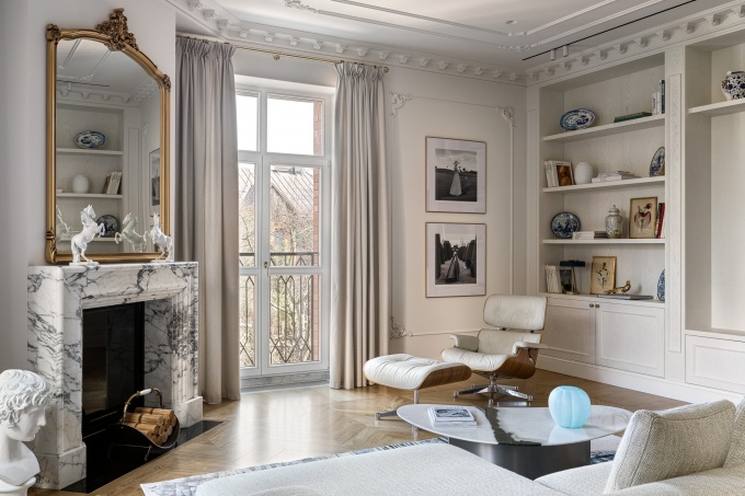 Особенность фасадов здания – исторические архитектурные приемы: арочные окна, крупный руст и «алмазная огранка» декоративных деталей. Именно они вдохновили автора на создание интерьера с необычной пластикой, деликатными рельефными орнаментами и элементами неоклассики.