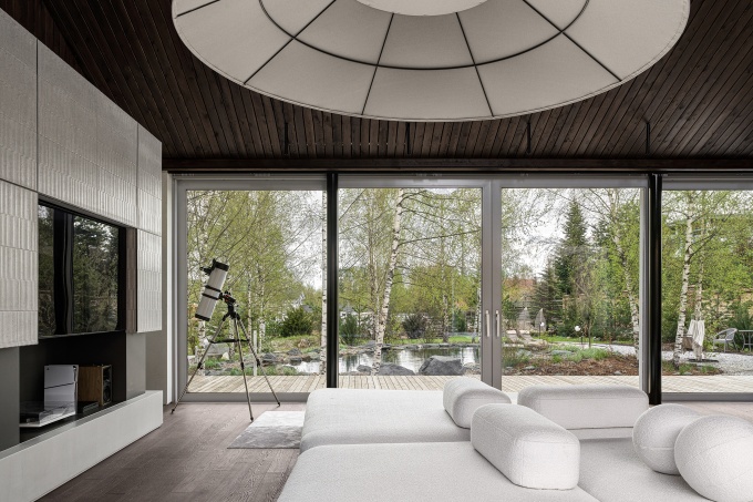Двухэтажный дом с панорамными окнами, террасами, бассейном и огородом на кровле находится в живописной части ближнего Подмосковья, в окружении соснового леса. Работа над ним велась в тандеме с архитектором Павлом Громовым, который занимался архитектурой дома и фасадными решениями. Это тот редкий пример, когда строительство и разработка интерьерных решений шли рука об руку. «Благодаря такому комплексному подходу нам удалось использовать пространство по максимуму и создать атмосферу, которая полностью соответствует статусу дома, его характеру и окружению», - рассказывает Екатерина.