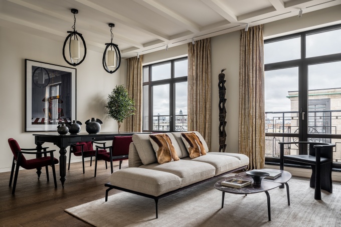 Большая квартира находится в доме премиум-класса на Шаболовской, из ее окон открывается вид на конструктивистскую застройку района и Шуховскую башню.