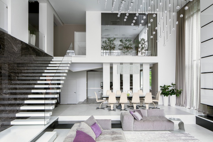 Конструктивный диалог позволил избежать ряда сложностей и оперативно, уже на первом этапе, внести важные корректировки. Например, добавить в проект консольную лестницу, поиграть с объемами общественных помещений, сделать разноуровневый пол в гостиной и даже изменить высоту потолков и размеры окон. Чтобы в итоге получить минималистский интерьер с открытыми широкими перспективами, интересным ритмом объемов и контрастной отделкой.