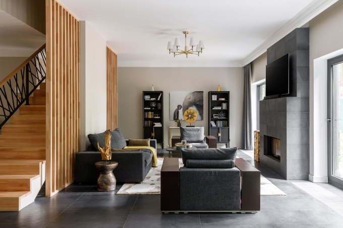 За 12 месяцев дизайнер Елена Андреева спроектировала и оформила двухэтажный современный дом площадью 300 кв. м, расположенный на Рублево-Успенском шоссе. Заказчик проекта – девелоперская компания AVA Villa Constructions – поставил жесткие условия по срокам, но дал полную свободу в реализации и выборе стилистики. «Я – фанат черного, и мне было очень интересно поработать с темной палитрой в жилом пространстве», - отмечает дизайнер.