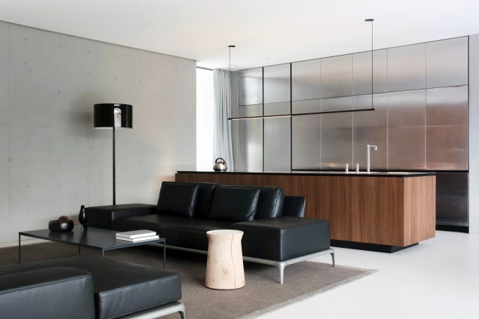 В итоге получился интерьер с ровными гладкими поверхностями, минимумом деталей и сдержанной палитрой в оттенках серого цвета.