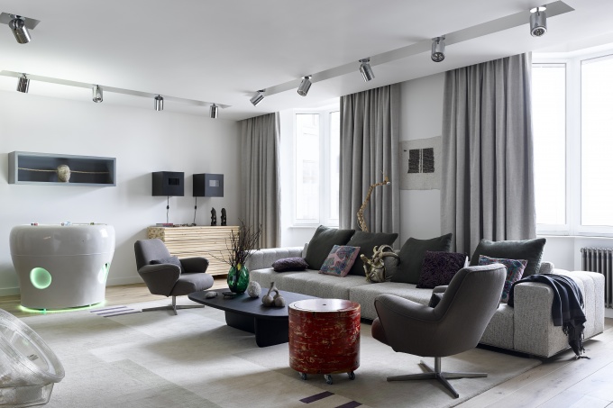 Для философа, деятеля и коллекционера актуального искусства дизайнер Марина Бусел в высотке «Триумф-Палас» оформила квартиру площадью 220 кв. м, придав ей сходство с музейным пространством с тем лишь отличием, что наслаждаться искусством можно в неформальной обстановке. «Заказчик хотел иметь пространство, где он будет принимать гостей в окружении произведений современного искусства из своей обширной коллекции. Пространство, которое будет источать спокойствие и вместе с тем нести мощный энергетический заряд.