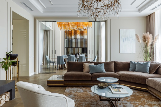 Внутри дизайнер внесла несколько небольших, но важных корректировок: изменила форму лестницы, превратив ее в парящую конструкцию на металлокаркасе с тонкими металлическими струнами, увеличила жилую площадь за счет присоединения балконов и лоджий и сделала акцент на столовую группу с витражным остеклением. Стилистически заказчики тяготели к современному интерьеру с мягкими текстурами и приятными взгляду формами. Дизайнер спроектировала респектабельный интерьер с парадными перспективами, изящными деталями, отсылающими к эпохе ар-деко, и потрясающим солнечным настроением.