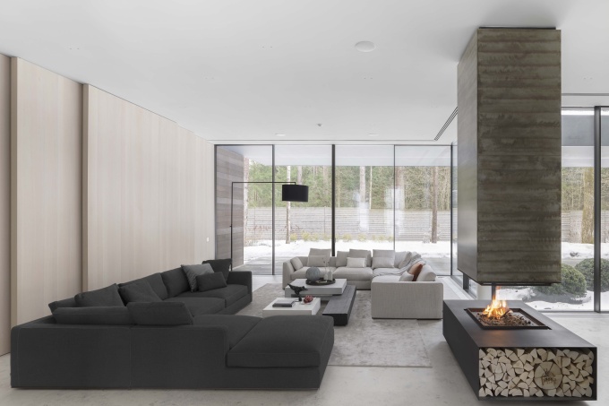 В камерном подмосковном поселке архитекторы бюро Александры Федоровой спроектировали и построили дом, в котором природа, архитектура и интерьер существуют в единой концепции. Двухэтажный дом площадью 680 кв. м расположен на достаточно компактном участке в 18 соток, сам поселок небольшой, но с плотной застройкой, на участке растут вековые сосны, которые хотелось сохранить. Все это определило облик и структуру здания, набранного из больших объемов с консольными выступами (6 и 8 метров) и с внутренним двором по центру. Парадные помещения дома ориентированы на Восток.