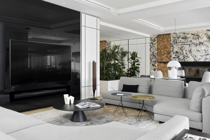 Площадь квартиры позволяла подойти к проектированию городской квартиры как к загородному жилью и помимо общих и приватных помещений организовать зимний сад, тренажерный зал, пять санузлов, две гардеробные комнаты, сделать в спальнях комфортные рабочие места. В итоге получилась удобная для семейного проживания квартира с дизайном в духе элегантного минимализма.