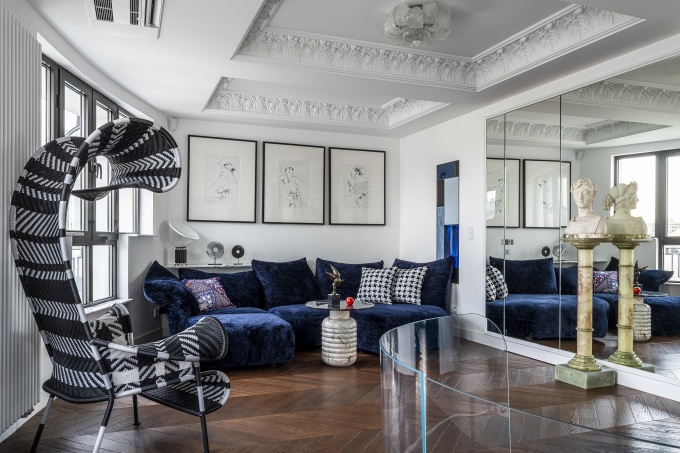 Интерьер квартиры был навеян поездкой в Италию, ее эстетикой, богатой культурой, мощным темпераментом. «Единогласно мы решили использовать в оформлении классическую базу как отражение атмосферы района и исторического облика здания, к которой добавили раритетный антиквариат и современную мебель любимых европейских брендов», - отмечают авторы проекта. В итоге получилось эклектичное пространство: очень нестандартное, с мощным культурным бэкграундом и яркой харизмой.