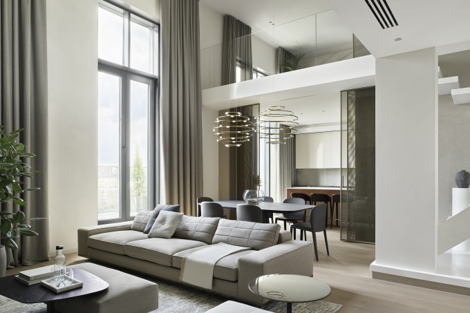 Архитекторы Анна и Кирилл Дунаевы оформили двухэтажный пентхаус, из которого открывается вид на одну из сталинских высоток – главное здание МГУ. Исходные данные были практически идеальными: новый современный дом, большая площадь, открытые объемы, окна на две стороны с террасами и потрясающие заказчики – очаровательная семейная пара, проживающая постоянно в одном из областных центров России.