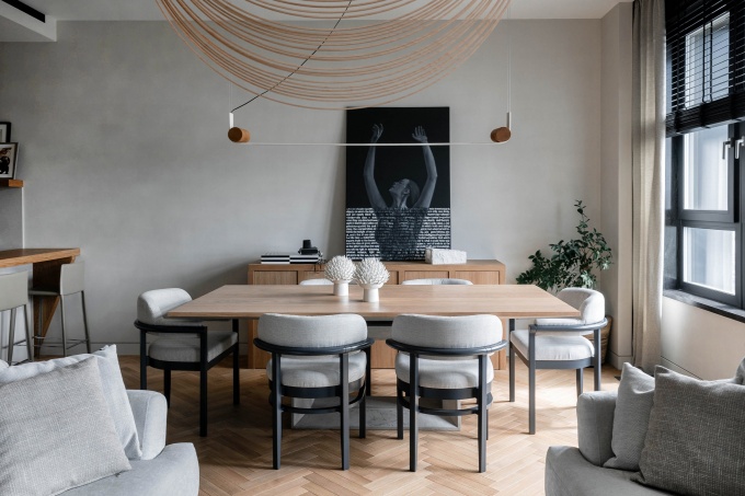 «Исходник» дизайнеру достался сложный, но интересный: высокие потолки, большие окна и деревянные перекрытия – все это, чтобы поддержать атмосферу и сохранить дух времени, требовало огромного внимания к каждой детали. «Квартира была в относительно нормальном состоянии, учитывая, что до продажи в ней жила семья с пятью детьми. Но, к сожалению, исторических деталей практически не сохранилось, кроме разве что фрагмента предположительно дореволюционного паркета. Его мы обнаружили при демонтаже напольного покрытия в одном из помещений под современным слоем, но никакие профессиональные экспертизы не проводили. А вторая историческая особенность – мусоропровод на кухне, который мы, естественно, заложили. Деревянные окна, лепные карнизы, двери с филенками – все новое, но в стиле интерьеров того времени», - рассказывает автор проекта, которой удалось создать убедительный исторический интерьер с современным уровнем комфорта.