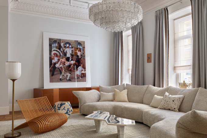 Квартиру было решено продать. Покупатель (также молодая пара с двумя детьми) нашелся быстро, интерьер его полностью устроил, из нового – добавилось только современное российское искусство. Хотя квартира в доме, построенном в конце XVIII – начале XIX века, и имеет богатую историю, после пожара 1870-го года, надстройки этажей в 1930-х и череды последующих ремонтов в ней не осталось ничего аутентичного. Найти информацию об интерьерах этого дома дизайнеру тоже не удалось. Поэтому она начала с чистого листа и создала парадный проект, в котором классика изящно смиксована с коллекционным дизайном, винтажными, антикварными и современными предметами. В процессе работы она также полностью отреставрировала подъезд, вернув ему былое величие.