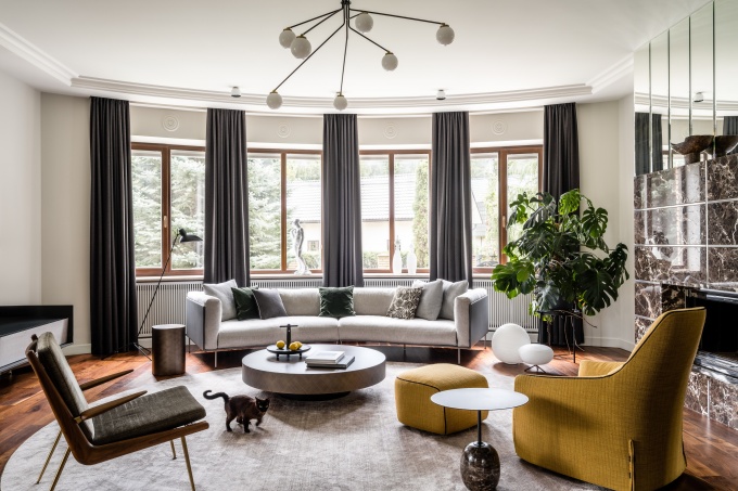 Перед дизайнером Сарой Михайлова стояла непростая задача превратить брутальный дом для холостяка в комфортное и яркое загородное жилье для семьи с двумя детьми. Современный двухэтажный коттедж площадью 680 кв. м с панорамным остеклением и открытой террасой задумывался как холостяцкая берлога, но у заказчика изменились планы, и он продал дом молодой семье.